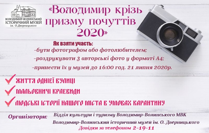 З метою поповнення музейної збірки оригінальними фотознімками м. Володимира-Волинського, а також організації онлайн – виставки до Дня міста відділ культури і туризму МВК та Володимир-Волинський історичний музей імені О. Дверницького оголошує фотоконкурс «Володимир крізь призму почуттів – 2020». До участі запрошують усіх охочих.