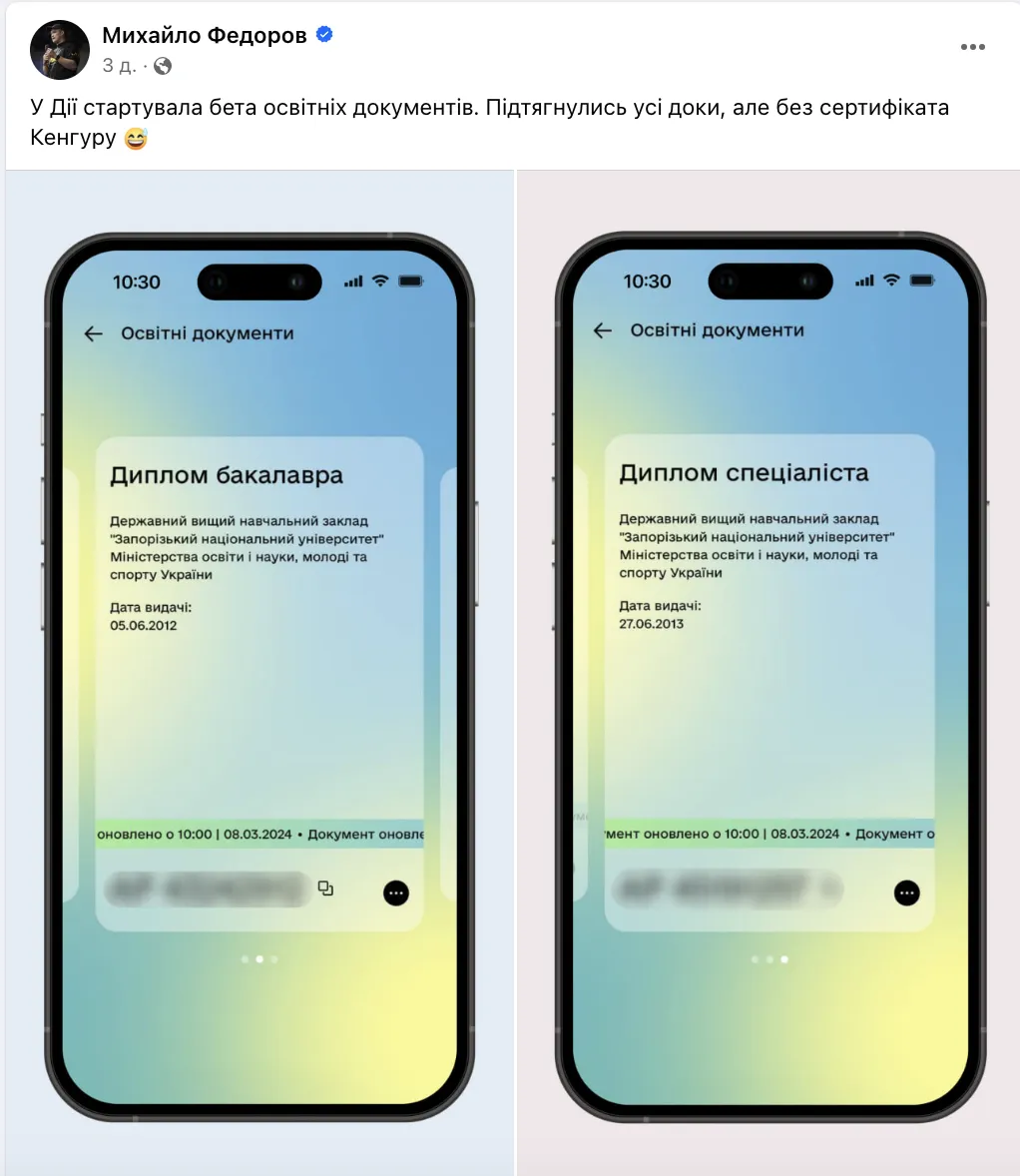 У застосунку Дія зʼявилися перші документи про освіту. Зокрема, “підтягнулися” перші атестати та дипломи українців, які взяли участь у бета-тестуванні. і про це повідомив міністр цифрової трансформації України Михайло Федоров. Тож тепер свідоцтва про здобуття освіти громадяни України, яким виповнилося 14 років, можуть зберігати в електронному форматі. У Дії стартувала бета (версія програми, потребує перевірки широкою кількістю користувачів. – Ред.) освітніх документів. Підтягнулись усі доки, але без сертифіката Кенгуру”, – повідомив Федоров.У Дії анонсували, що послуга буде доступна всім користувачам після успішного завершення тестування.Свого часу, очільник Мінцифри повідомив, що у сервісі будуть доступні документи, починаючи від свідоцтва про загальну середню освіту до дипломів докторів філософії. Для цього потрібно мати ідентифікаційний код.Користувачі застосунку встигли оцінити якість наданих послуг та подякували Федорову за зручність застосунку, зазначивши, що все легко та доступно.