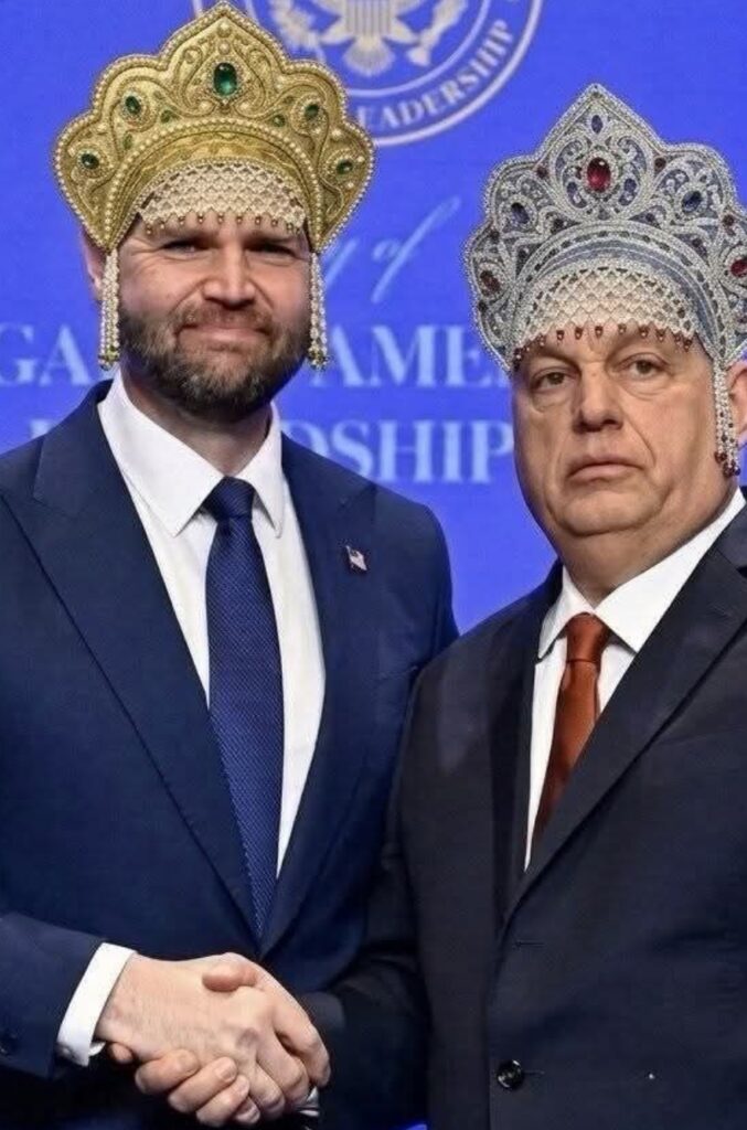 На фото «Німецької хвилі» та з відкритих джерел: антиукраїнська агітація партії чинної влади; виступ віктора орбана; лідер «Тиси» Петер Мадяр; мем із соцмереж щодо проросійської орієнтації Джей Ді Венса і віктора орбана.