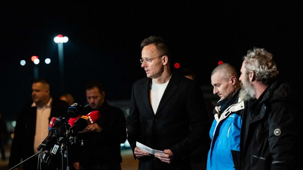 На фото пресслужби Антитерористичного центру Угорщини та Петера СІЯРТУ: вилучена валюта і золото; глава МЗС Угорщини і двоє звільнених з полону рф військовослужбовців, які мають угорське та українське громадянство, в аеропорту Будапешта, 5 березня 2026 року.