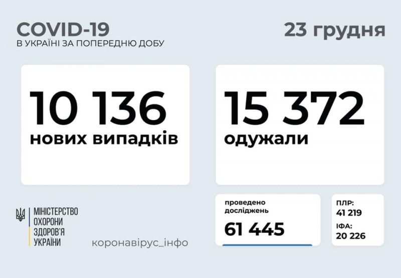 на 23 грудня в Україні зафіксовано 10 136 нових випадків коронавірусної хвороби