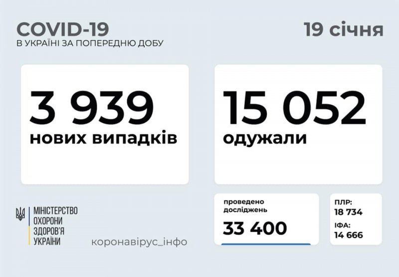 на 19 січня в Україні зафіксовано 3 939 нових випадків коронавірусної хвороби