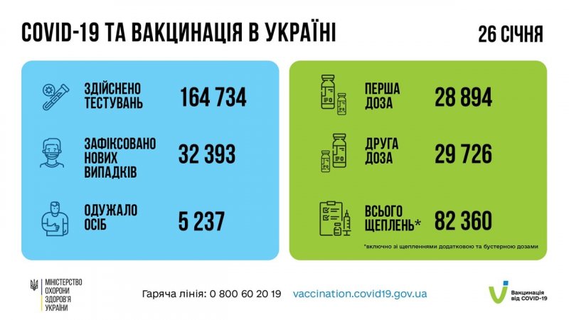 добу 26 січня в Україні зафіксовано 32 393 нових підтверджених випадків