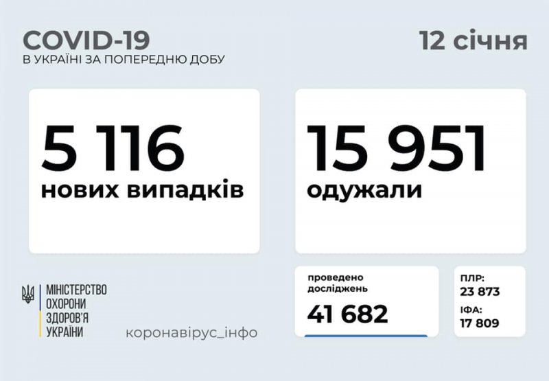 на 12 січня в Україні зафіксовано 5 116 нових випадків коронавірусної хвороби