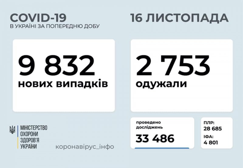 на 16 листопада в Україні зафіксовано 9 832 нових випадки коронавірусної