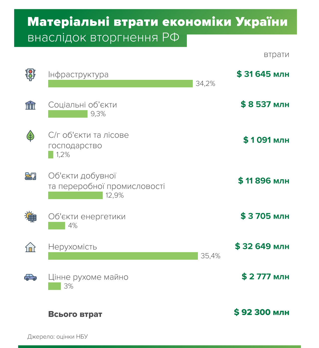 «За оцінкою Національного банку, втрати фізичного капіталу через війну зараз перевищують $92 млрд. Така оцінка є близькою до розрахунків Київської школи економіки та Міністерства економіки України, але структура завданої шкоди відрізняється», – йдеться в повідомленні.