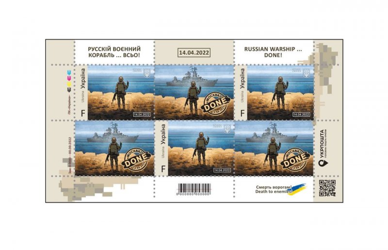 Нова марка традиційно вийде у двох номіналах: “Русскій воєнний корабль … ВСЬО! Смерть ворогам!” F для відправлень по Україні та “Русскій воєнний корабль … ВСЬО! Слава нації!” W для міжнародних відправлень. Вартість аркуша (3 марки та 3 купони) 69 грн та $4,5 відповідно.