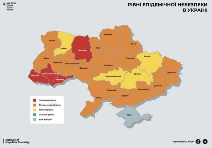 В Україні 16 регіонів і столиця опинилися в “помаранчевій” зоні за показниками поширення коронавірусу, 4 області – “жовті”, стільки ж “червоних”.