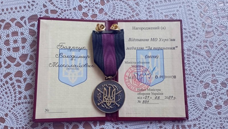 49-річний Володимир Боячук є одним з славних воїнів 68 окремої єгерської бригади ім.Олекси Довбуша, які звільнили не одне село на Донеччині від окупанта. Загарбники опирались до останнього. В одному з таких боїв Володимир і отримав порання в голову. За жертву крові в боях за волю України захисник отримав від міністрества оборони України медаль “За поранення”.