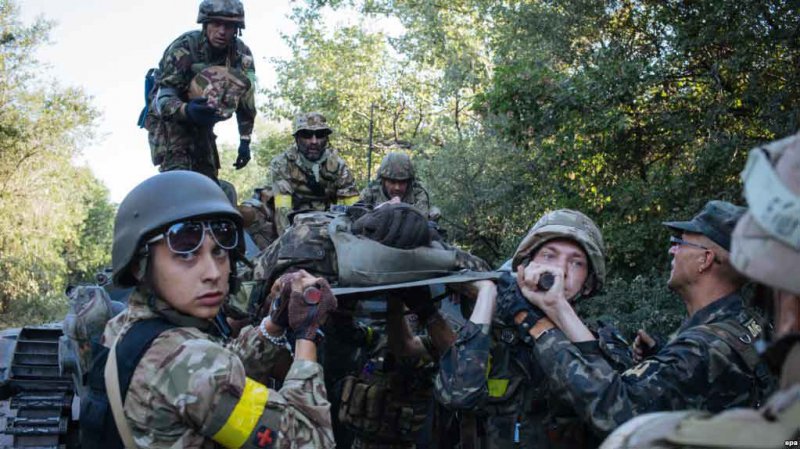 На фото «Радіо «Свобода»: евакуація українських поранених під Іловайськом. Серпень 2014 р.