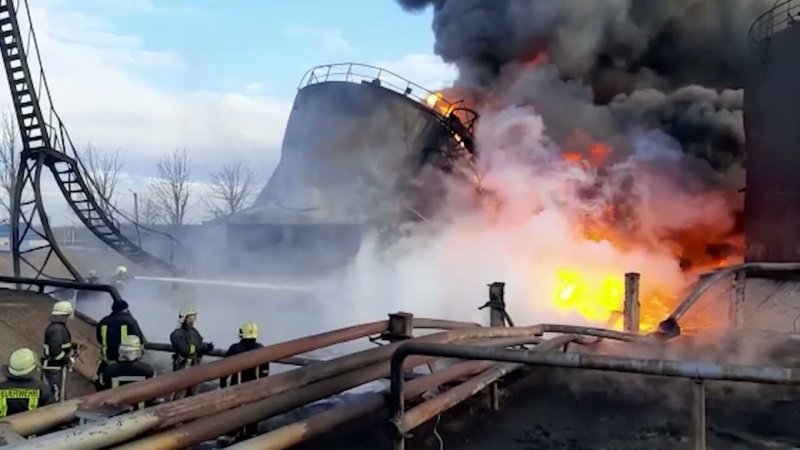 На фото рятувальників: пожежа на нафтобазі внаслідок ракетного удару 27 березня 2022 р.