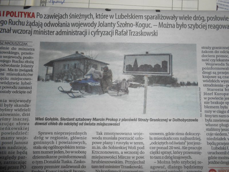 Трикутник Грубешів-Замость-Хелм виявився аномальною зоною, де, як у знаменитому Бермудському тезці, безслідно зникало все, що рухалося. Внаслідок потужних снігопадів буквально кілька десятків кілометрів західніше від наших Любомльського, Володимир-Волинського та Іваничівського районів більшість місцевих доріг виявилися заметеними, тому пересуватися ними виявилося неможливо. Щоби допомогти відрізаним від зовнішнього світу людям, були задіяні спецтехніка та людські ресурси силових структур. Наприклад, допоки фахівці з надзвичайних ситуацій пробивали тунелі, щоб повернути в дію дороги, військовослужбовці Надбужанського відділу Прикордонної варти РП снігоходами доставляли людям продукти та предмети першої необхідності буквально до їхніх домівок.