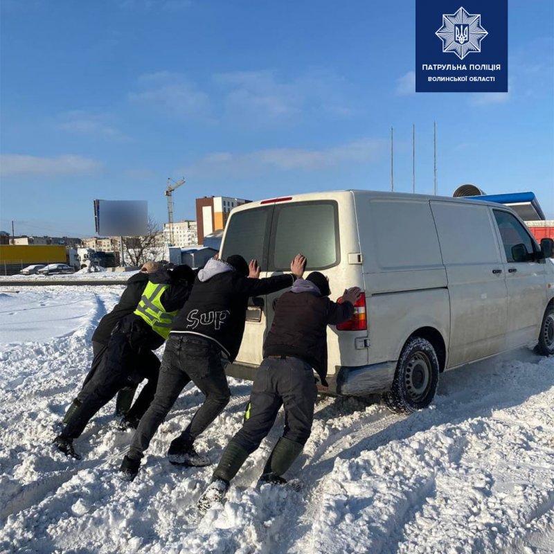 Зокрема волинські патрульні цілодобово несуть службу, допомагають виштовхувати автівки, регулюють рух під час діставання вантажівок працівниками ДСНС та скидання снігу, також надають супровід снігоочисній техніці.