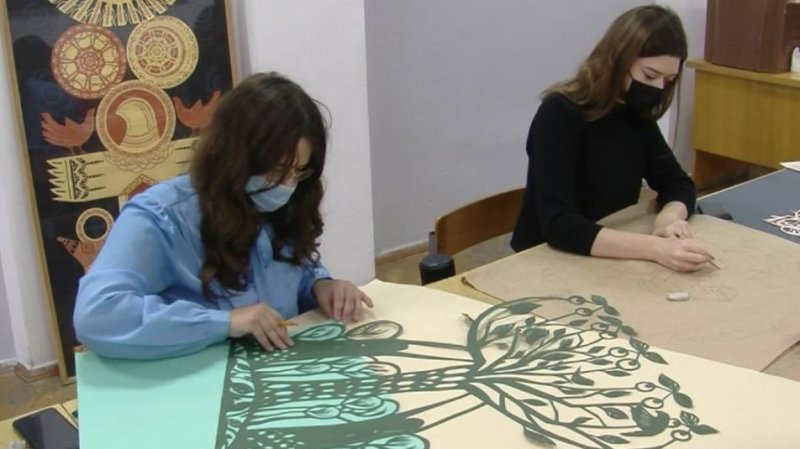 Викладачка кафедри образотворчого мистецтва та дизайну Галина Вахрамєєва навчає створювати витинанки. Із її слів, студенти працюють у класичній техніці з папером.