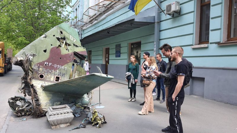 фото газети Вечірній Київ: фрагмент збитого ворожого літака біля Центрального будинку офіцерів ЗСУ.