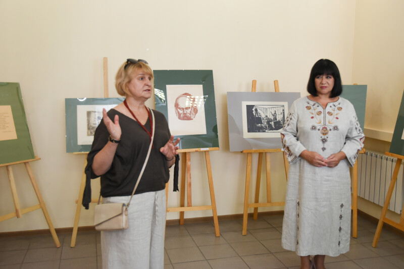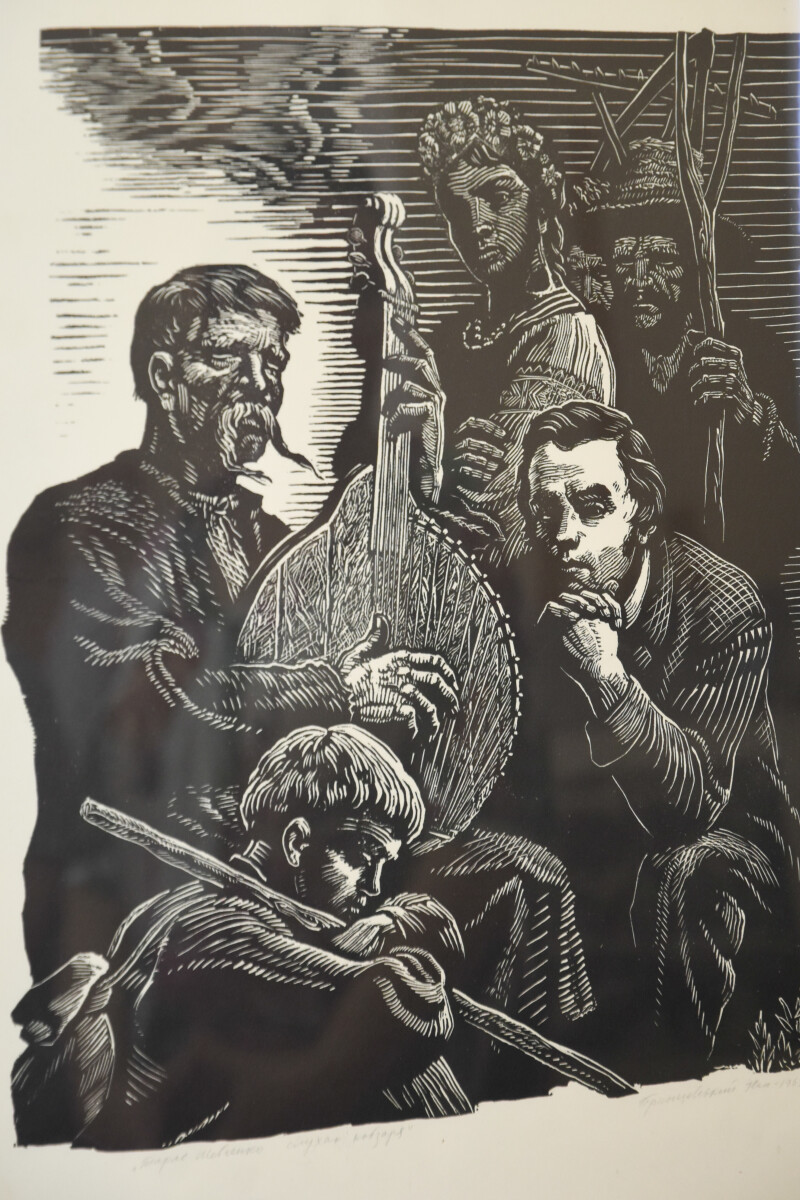 На виставці експонуються поліграфічні копії творів художників-графіків Федора Глущука, Сергія Гришина, Олександра Данченка, Анатолія Навроцького, Георгія Зубковського. Це роботи у жанрах портрету та пейзажу, а також ілюстрації до творів Тараса Шевченка. Як і належить, естампи мають авторський підпис і дату, проставлену внизу твору.