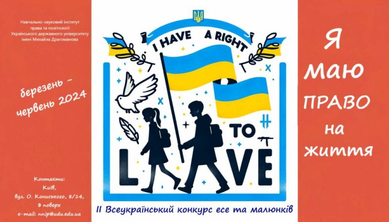 У березні-червні 2024 року Навчально-науковий інститут права та політології УДУ імені Михайла Драгоманова за підтримки міністерств і відомств проводить ІІ-ий Всеукраїнський конкурс есе та малюнків «Я маю ПРАВО на життя»!