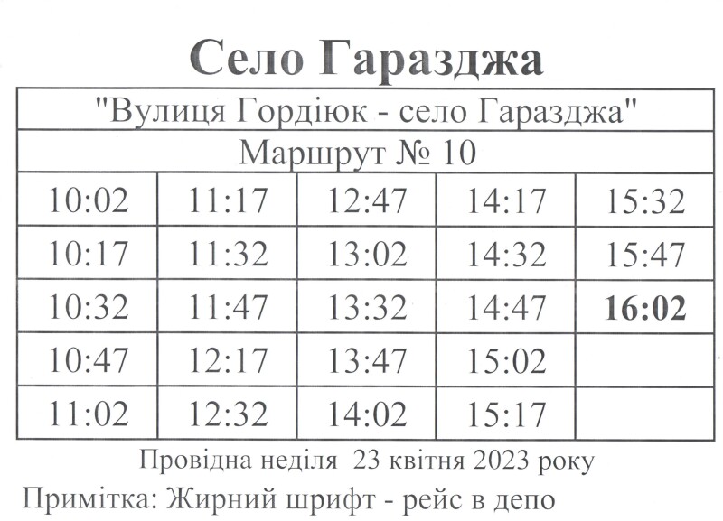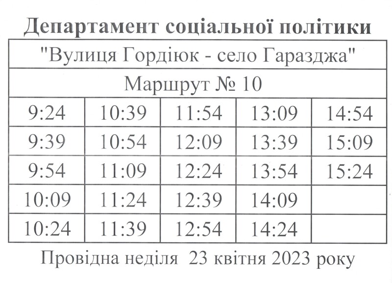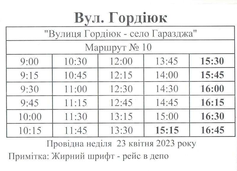 Час відправлення з зупинок “Вулиця Гордіюк”, “Департамент соціальної політики”, “с.Гаразджа (кладовище)” додається.