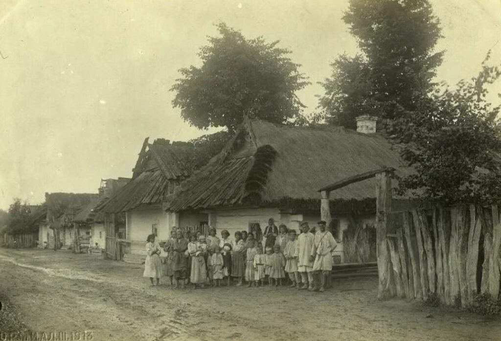 На фото Мар’яни МИЦЬ, Володимира Сахарова і автора: таким був палац Поморських у селі Новий Двір; стандартна хата на Волині 100 років тому; вулиця Нового Двора, літо 2025 року.