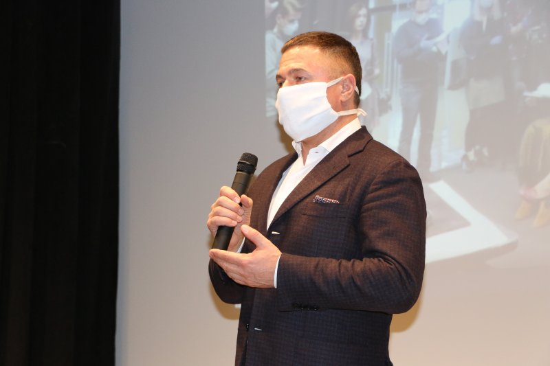 Голова облдержадміністрації Юрій Погуляйко також одягнув захисну маску. Виступаючи, подякував
