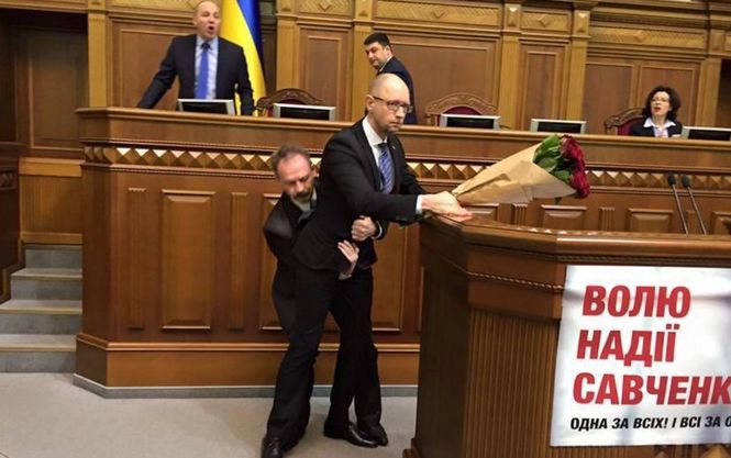 та доброволець АТО Олег Барна намагається винести Арсенія Яценюка в залі, після