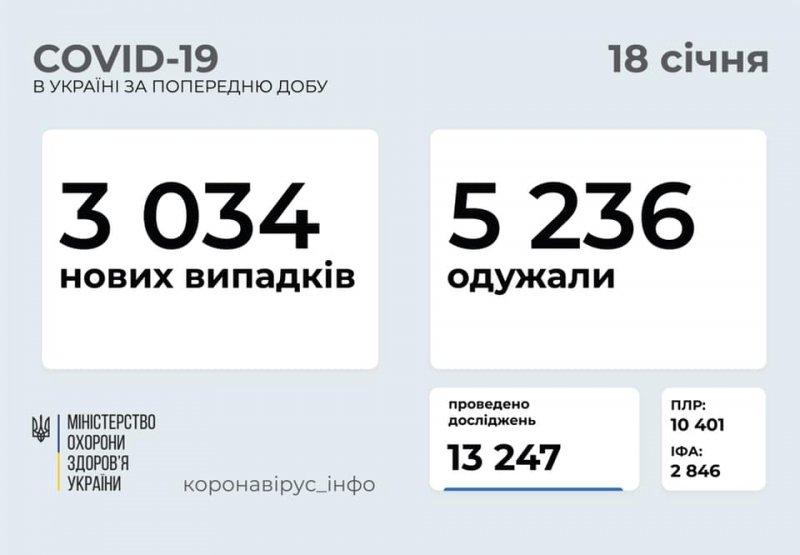 3 034 нових випадки коронавірусної хвороби COVID-19 зафіксовано в Україні станом на 18 січня 2021 року. Зокрема, захворіли 107 дітей та 87 медпрацівників.
