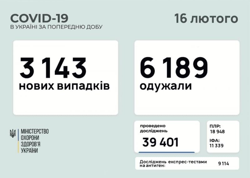 3 143 нових випадків коронавірусної хвороби COVID-19 зафіксовано в Україні станом на 16 лютого 2021 року. Зокрема, захворіли 182 дитини та 179 медпрацівників.