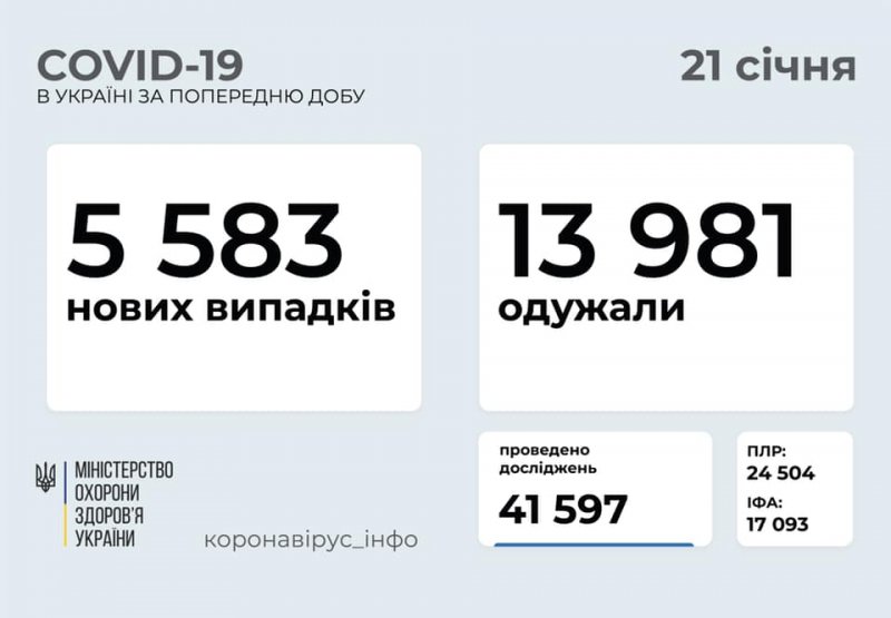 5 583 нових випадки коронавірусної хвороби COVID-19 зафіксовано в Україні станом на 21 січня 2021 року. Зокрема, захворіли 173 дитини та 229 медпрацівників.