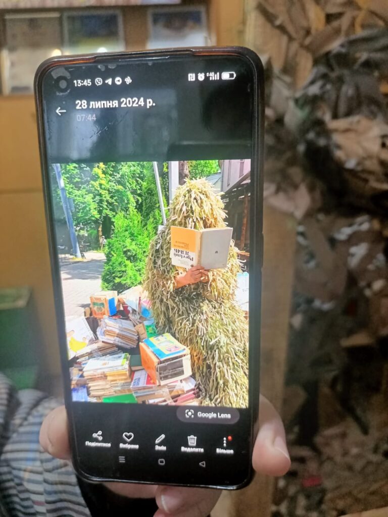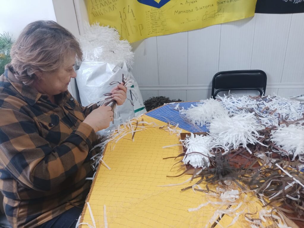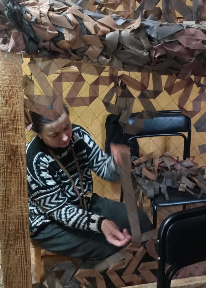 На фото з відкритих джерел і автора: кипить робота у Волонтерському центрі; з цих фрагментів створюється маскувальний костюм «кікімора»; під час публічної роботи на літному Театральному майдані; прапори вдячності; за роботою; ці маскувальні сітки вже поїхали на фронт.