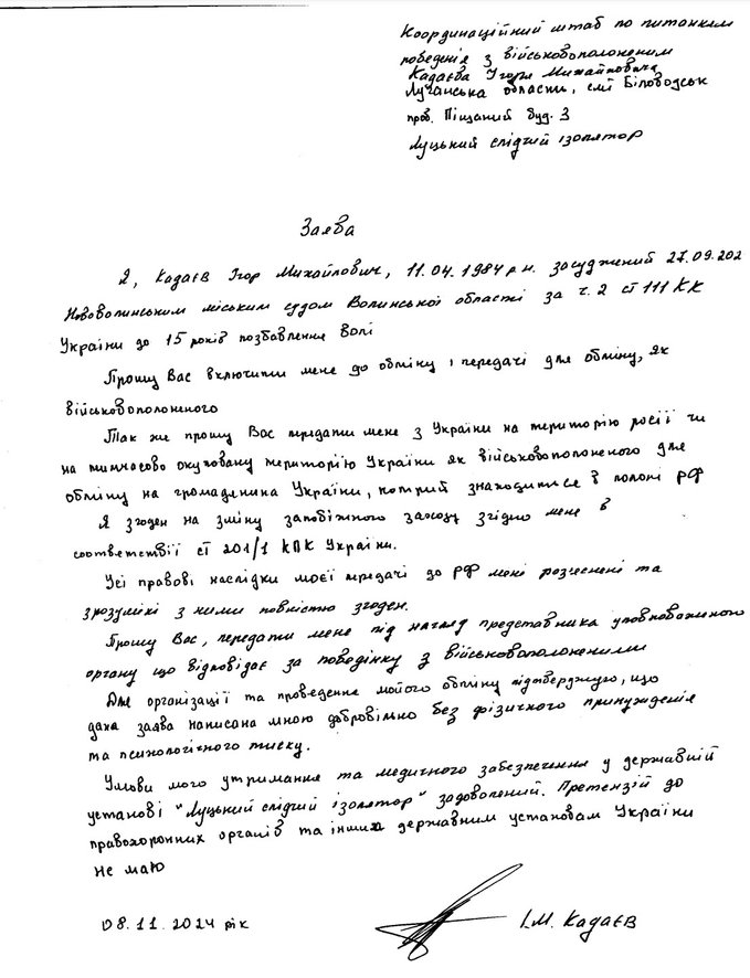В жовтні ц. р. прикордонника з Луганщини ігоря кадаєва засудили на 15 років позбавлення волі. А в листопаді він написав лист до Координаційного штабу з питань поводження з військовополоненими і попросив передати його у росію, або на тимчасово окуповану рф територію.