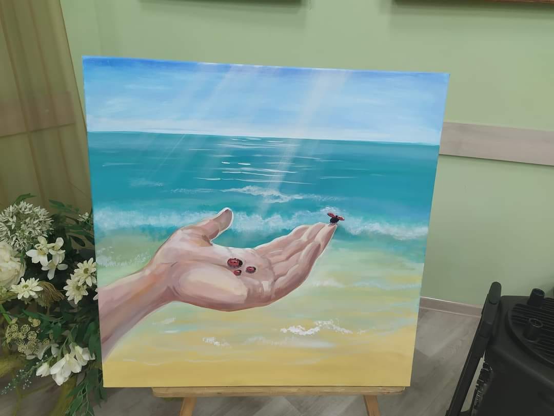 «Хочу намалювати це сонечко, ніби це я у чоловічій долоні. І все це на фоні моря. Ми, як і багато сімей, відкладали відпустки, подорожі. Ми уже навіть планували, що у 2022 році влітку поїдемо кудись з синами. Бо раніше, то діти маленькі, то ремонт, постійно якісь проблеми. Так і не вийшло, – розповідає Оксана. – Хочеться людям цією картиною донести, що не треба відкладати на потім те, що плануєте зараз. Робіть сьогодні те, що хочеться, проводьте разом більше часу, щоб потім не шкодувати. Раніше теж ми про це говорили, але тепер це зовсім інакше сприймається. Треба жити тут і зараз».