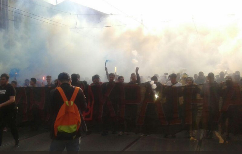ультрас «Металіста 1925» крокують на стадіон із вигуками «Путін – х…ло!» та «Україна