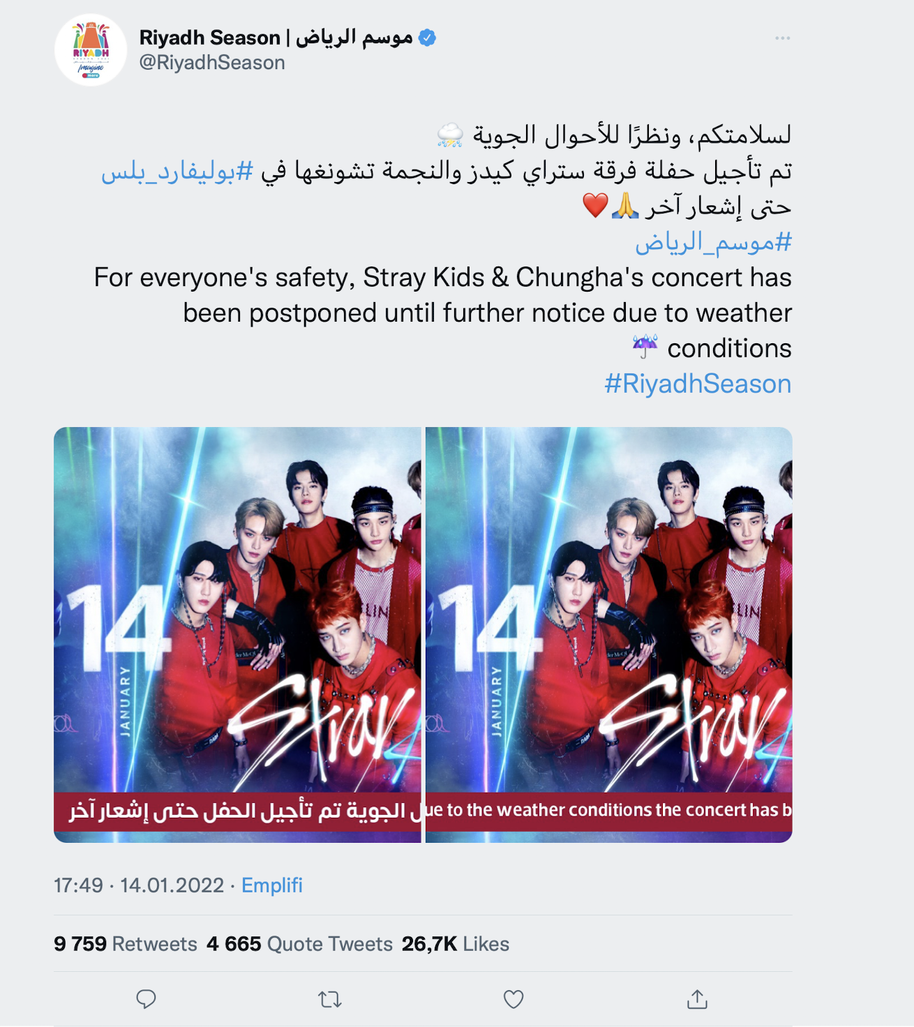 Туркі Аль-Шейх, генеральний директор General Entertainment Authority і голова Riyadh Season, написав у Твіттері, що через погодні умови в Ер-Ріяді заходи довелося перенести.
