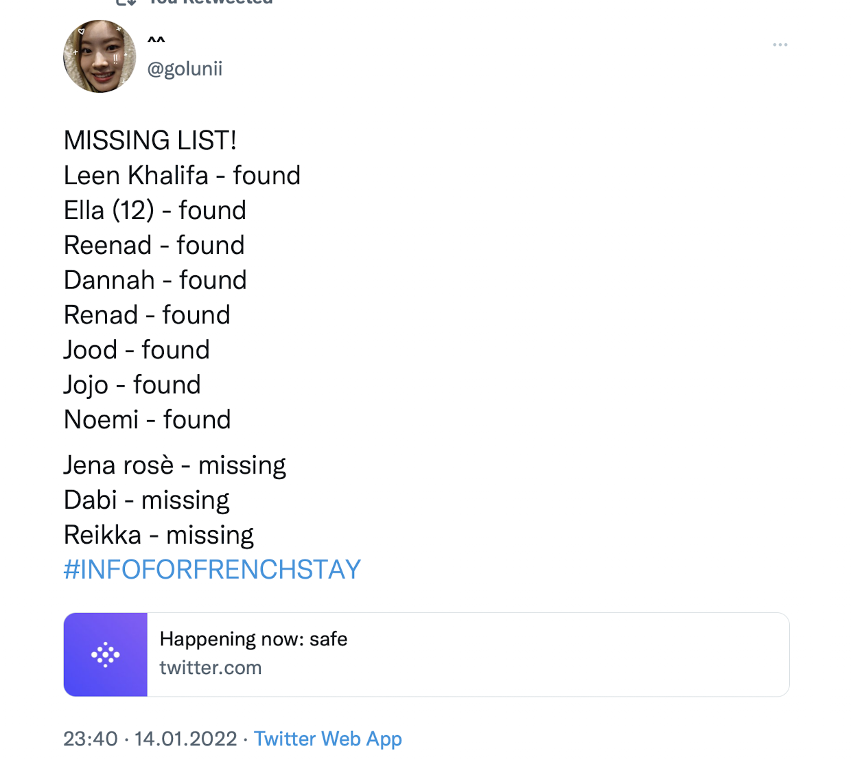 Серед офійно зниклих було 12 дівчат, за деякими даними їх було 14. За допомогою ретвітів та поширення у Твіттері аудіокімнат, де присутні там ділилися актуальною інформацією, усіх вдалося знайти.